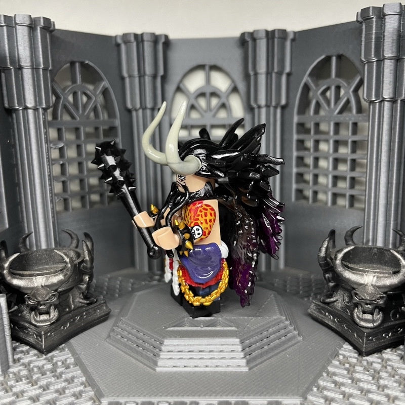 The detailed base and background, featuring the spiked throne room, further elevate the figure’s presence, making this minifigure a striking addition to your One Piece collection.