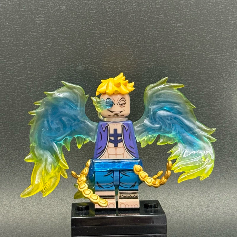 This custom figure captures Marco in his hybrid form — featuring translucent blue-to-yellow phoenix wings, his signature flame-like eye effect, and golden claw feet. The design reflects the power of the Tori Tori no Mi, Model: Phoenix, a Devil Fruit that grants both flight and near-invincibility through magical regeneration flames.