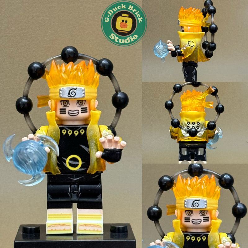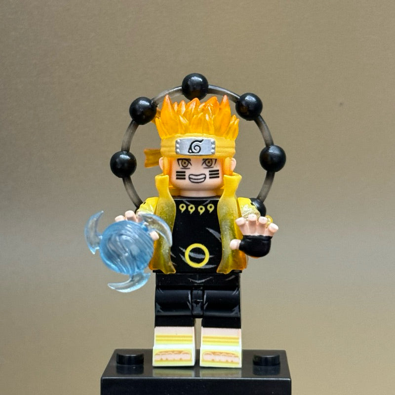 The minifigure is equipped with a chakra orb in one hand, representing the Six Paths Senjutsu. This glowing orb, crafted with translucent blue resin, adds dynamic energy to his display, reflecting the intense chakra control Naruto has in this form. The black orbs surrounding his head symbolize the Truth-Seeking Balls, which are a manifestation of the Six Paths power, representing ultimate chakra manipulation.